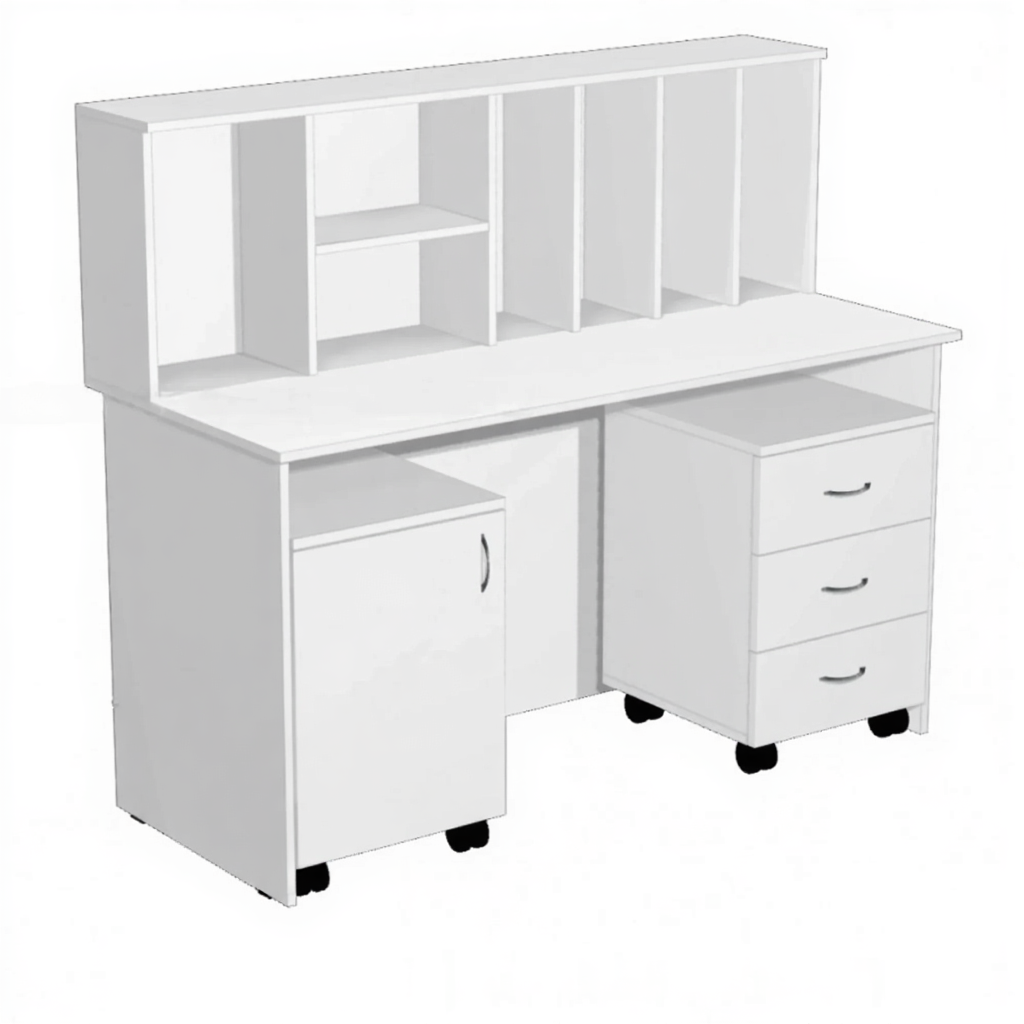 Стол-барьер рабочий ПМ (ЛДСП белый) — это специализированная мебель для оснащения рабочего места дежурной медсестры, осуществляющей круглосуточный уход за больными, контроль состояния их здоровья, оказание первой и неотложной помощи, а также проведение планового медикаментозного лечения. Модель имеет прямую конструкцию с надстройкой из 5 вертикальных и 2 горизонтальных секций, а также две подкатные тумбы.