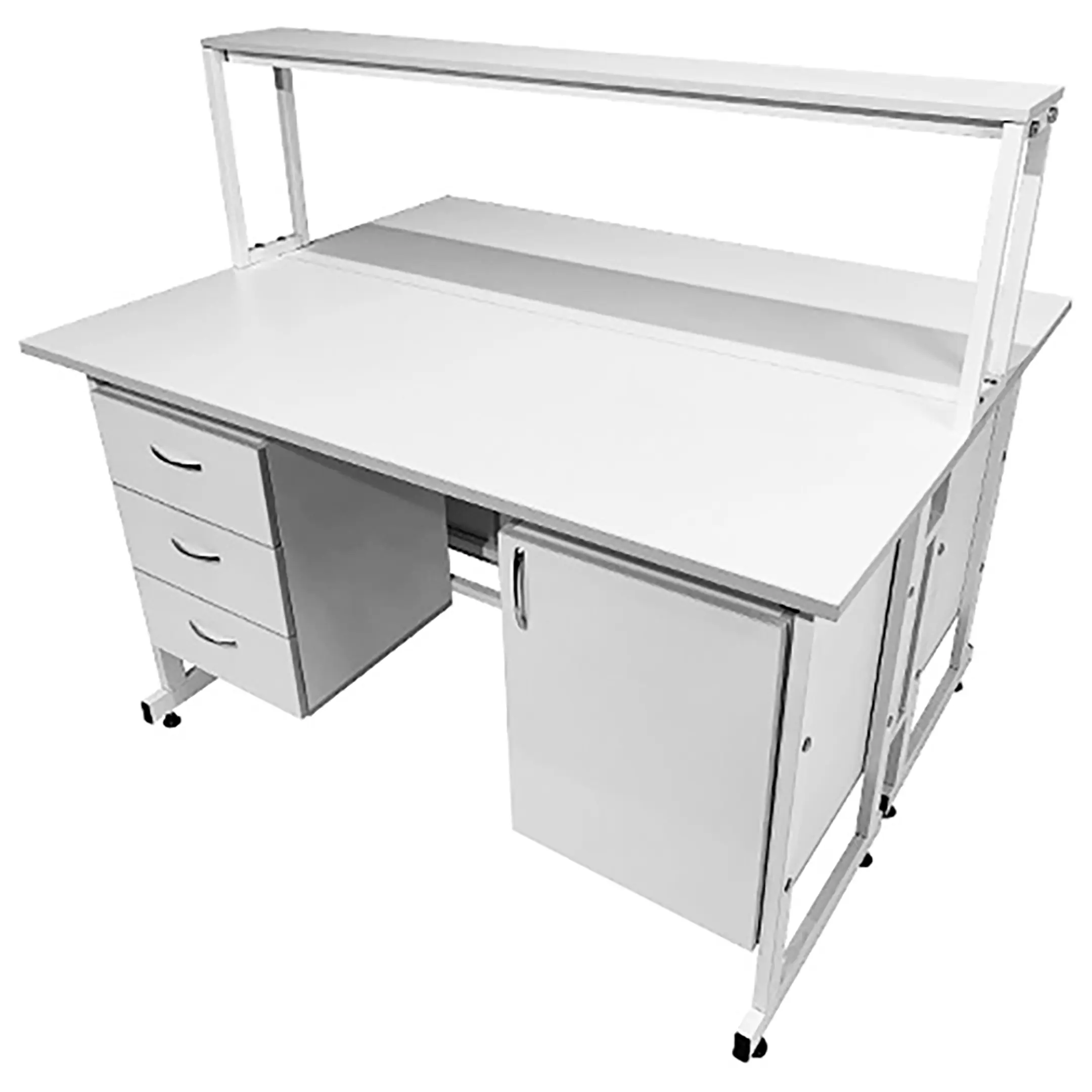 Стол лабораторный островной с надстройкой Сло 22.012 (белый) создан для удобной организации двух рабочих мест, идеально подходящих для лабораторий или медицинских учреждений. Благодаря его продуманным конструктивным особенностям, максимально рационально используются свободные пространства помещения. Модель оснащена двумя рабочими местами, каждое с двумя подвесными тумбами: слева с тремя выдвижными ящиками, справа с распашной дверкой и полкой, а также центральной надстройкой с одной полкой. Каркас выполнен из стального профиля, столешницы из ЛДСП толщиной 22 мм.