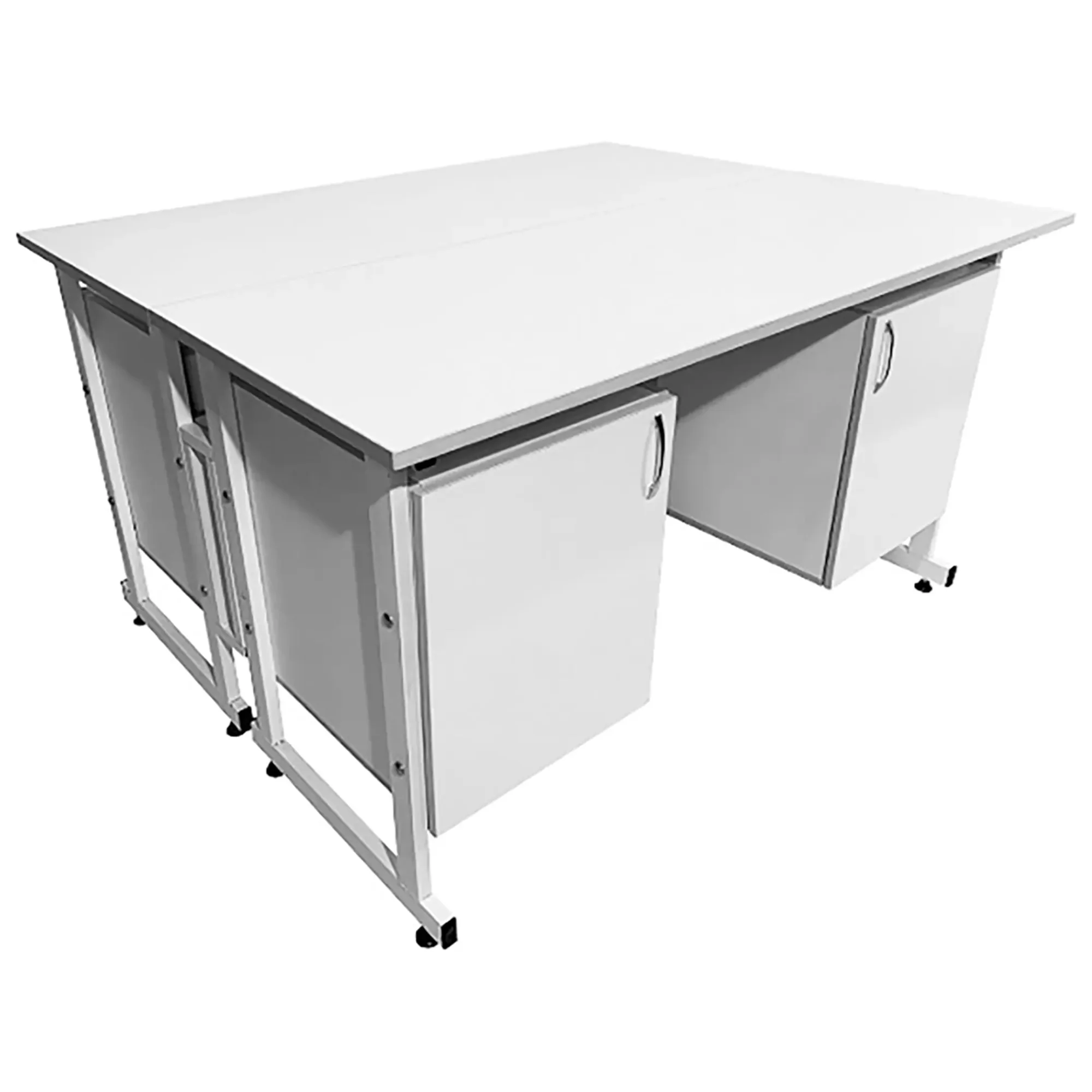 Стол лабораторный островной Сло 22.004 (белый) — это оптимальное решение для организации двух рабочих мест в лабораториях и медицинских учреждениях, способствующее рациональному использованию доступного пространства. Модель оснащена двумя рабочими местами, каждое с двумя подвесными тумбами с распашными дверками и полками. Каркас выполнен из стального профиля, столешницы из ЛДСП толщиной 22 мм.