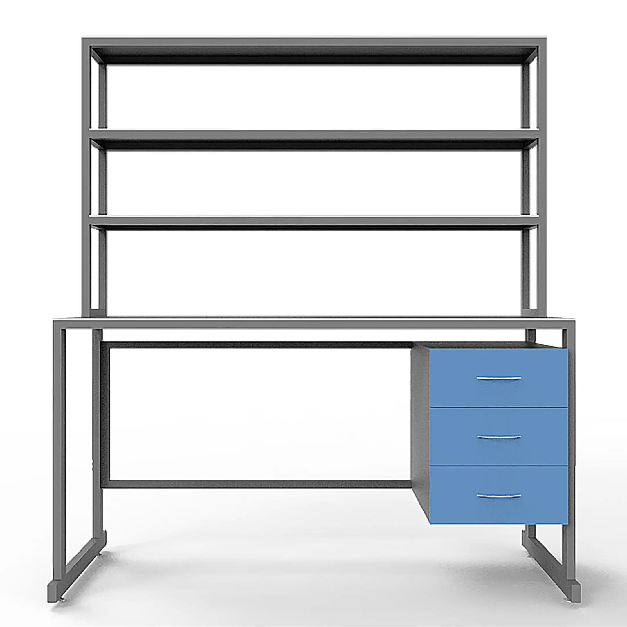 - Функциональная надстройка — три полки для дополнительного размещения оборудования, общая высота стола с надстройкой 1850 мм.
