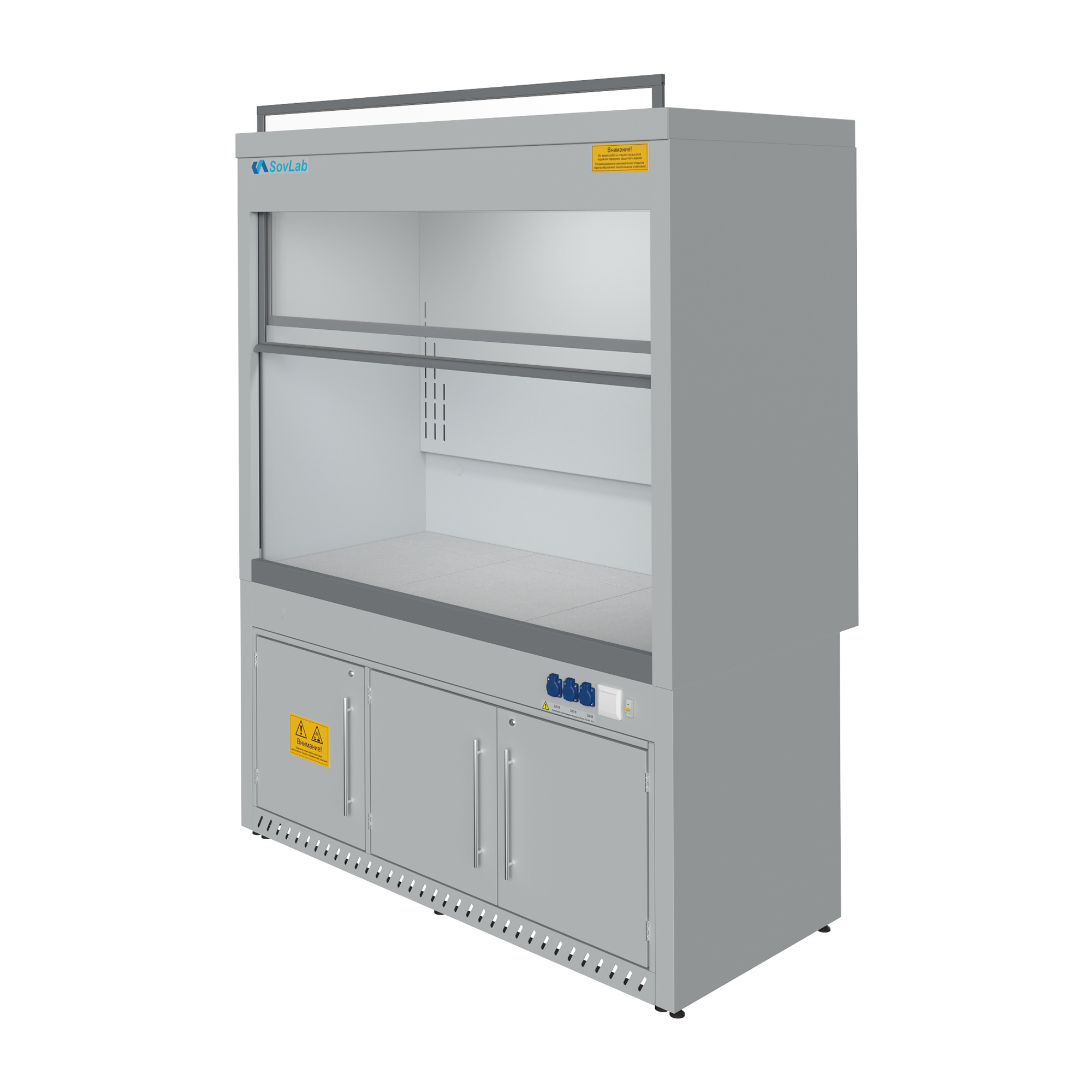 - Безопасная работа с летучими веществами — вертикально-подъемный защитный экран из ударопрочного стекла «Триплекс» с системой противовесов для плавного хода и фиксации на любой высоте.