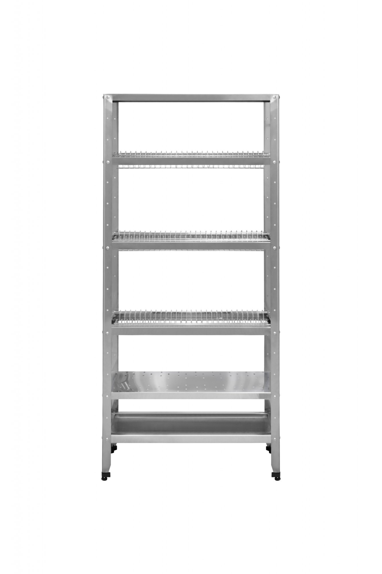 5 полок (сверху-вниз: верхняя сплошная, 3 полки для посуды, перф.полка для сушки стаканов) + поддон-полка с углублением для сбора стекающей воды.