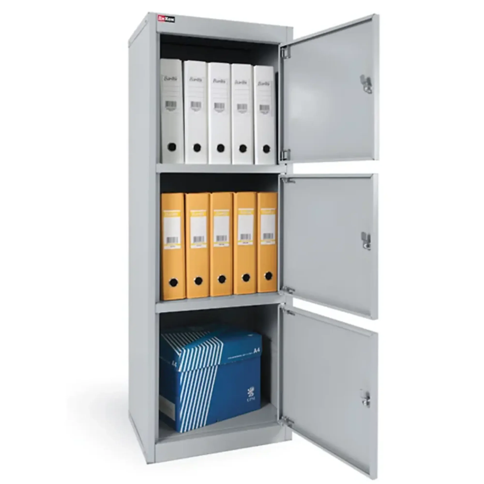 - Надежная и долговечная конструкция — шкаф изготовлен из прочной листовой стали с антикоррозийным порошковым покрытием, что обеспечивает устойчивость к механическим нагрузкам, деформациям и гарантирует длительный срок службы даже в условиях интенсивной эксплуатации. Распашная дверца оснащена надежным встроенным замком с ключом.