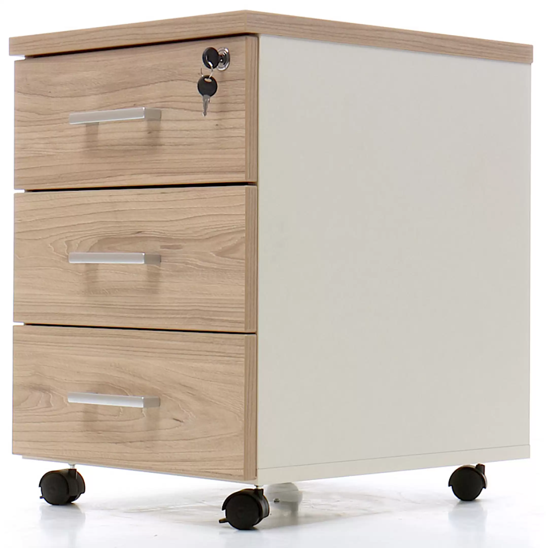• запирается центральным замком и оснащена пластмассовым лотком для канцелярских принадлежностей в верхнем ящике;