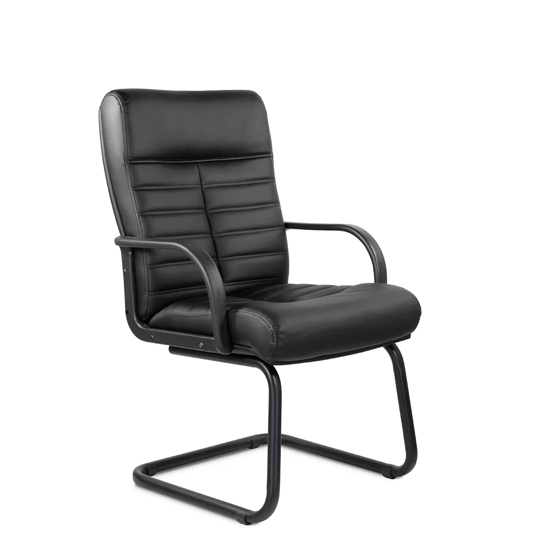 Массивное кресло с горизонтальными прострочками по ширине всей спинки и углублением. Пластиковые подлокотники обеспечат комфортную посадку на весь рабочий день. Модель отлично подойдет для приемной, переговорной в строгом стиле.