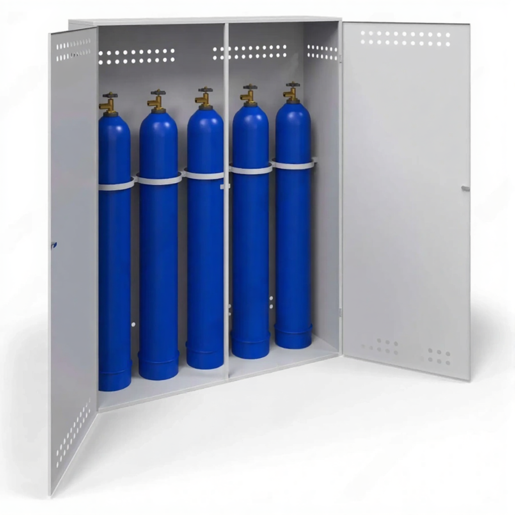 - Обеспечение требований пожарной безопасности — усиленный металлический корпус служит надежным барьером, изолируя баллоны от возможных источников возгорания, искр и тепла. Наличие системы естественной вентиляции (перфорация или вентиляционные решетки) предотвращает образование взрывоопасной концентрации газа в случае утечки, что строго соответствует нормам ППР в РФ.