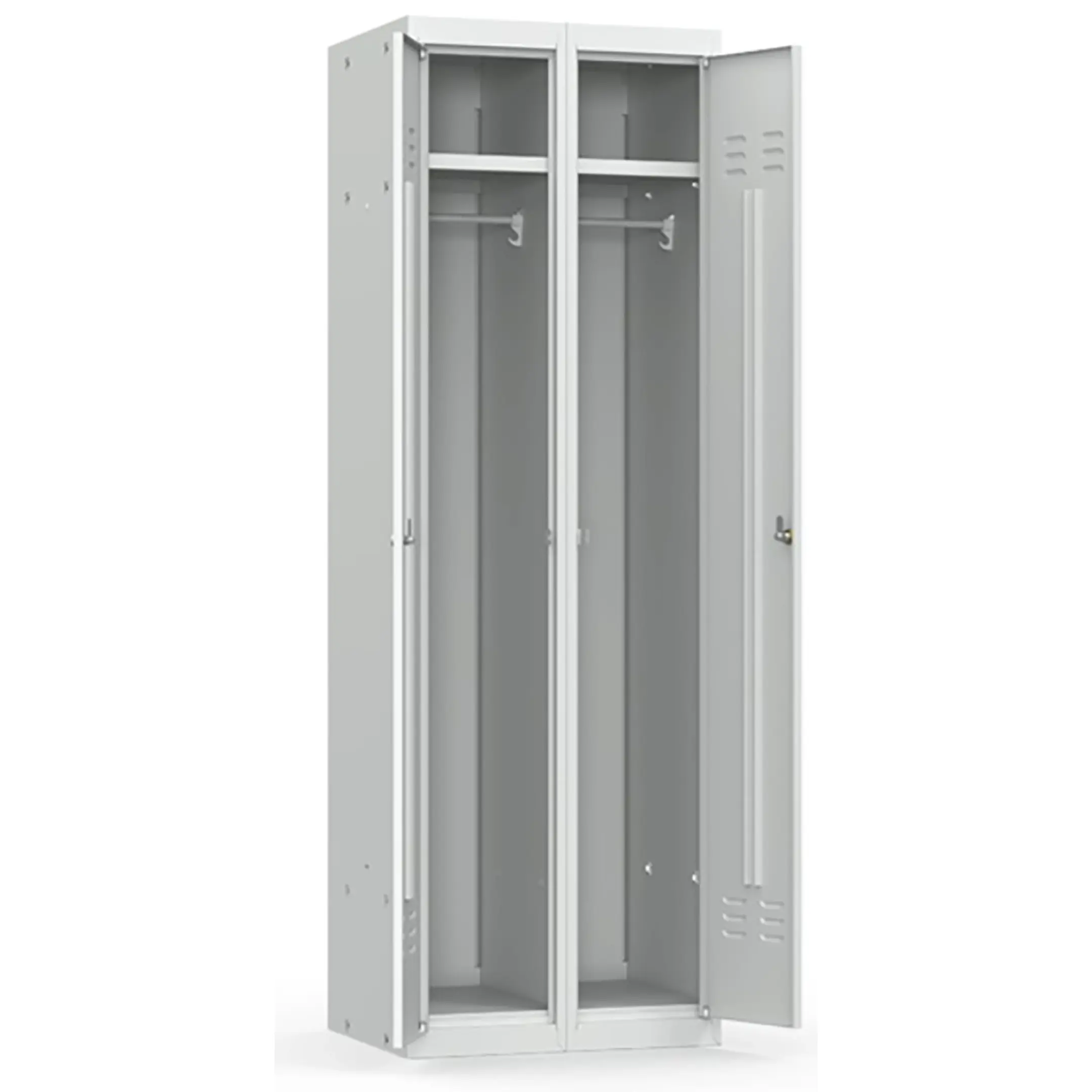 • Шкаф имеет две секции, каждая из которых оснащается полкой для головных уборов, пластиковыми перекладиной для вешалок и двумя крючками для одежды, проушиной для навесных замков;