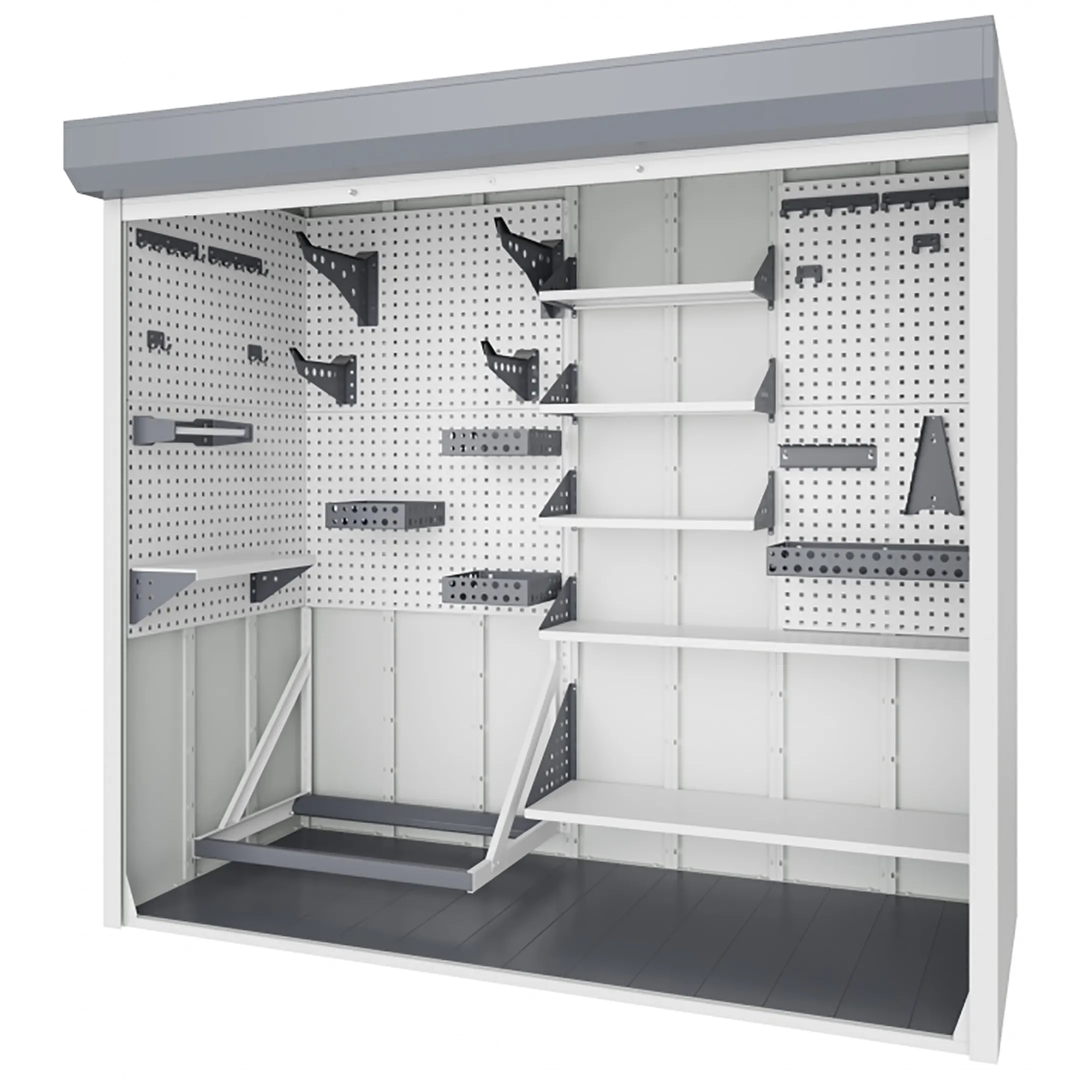 - Оптимальные габариты для крупного инвентаря — высота 2000 мм и ширина 950 мм позволяют удобно хранить вертикально стоящий велосипед (в том числе с высоким рулем), лыжи, сноуборд, садовый инвентарь, чемоданы и другие громоздкие предметы.