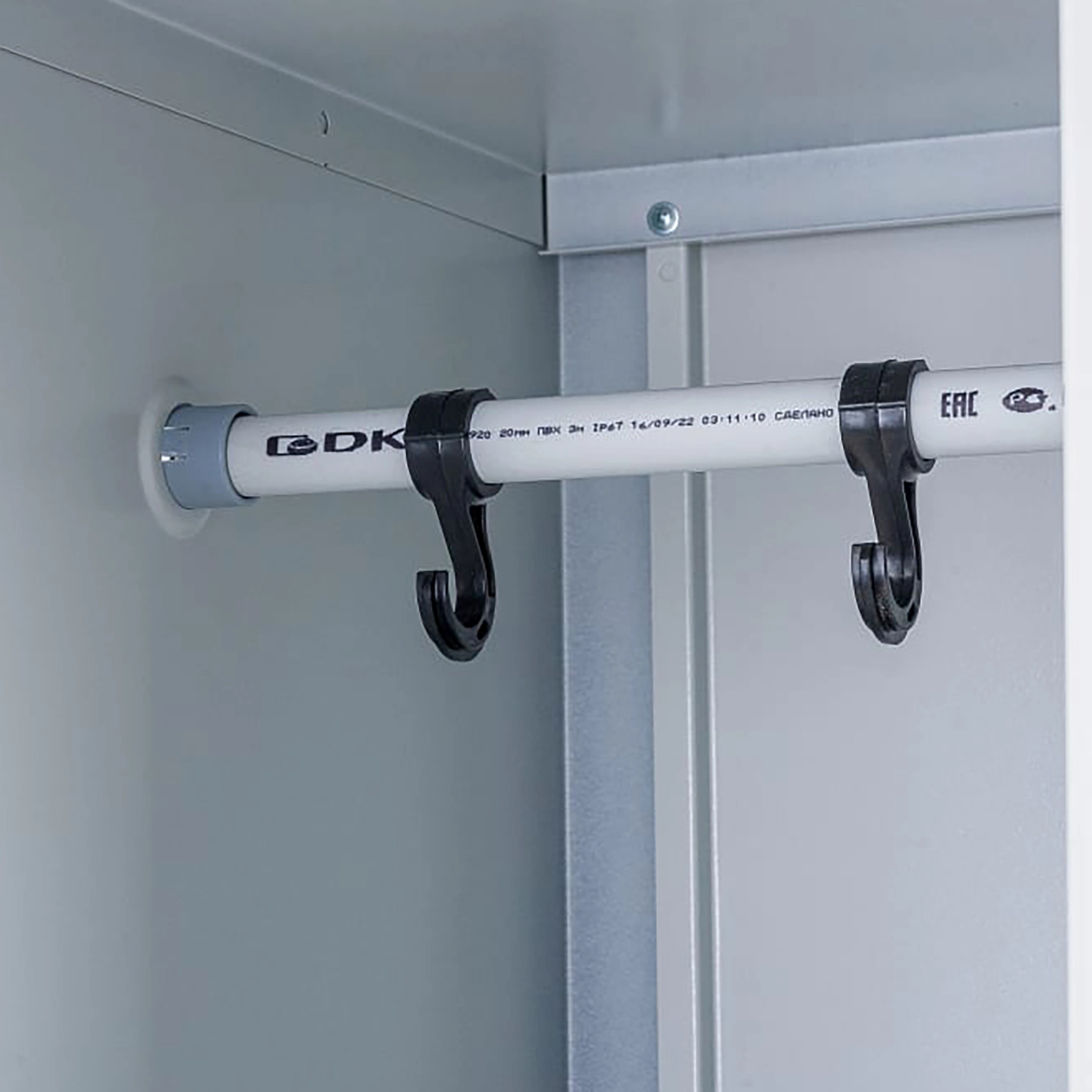 • внутри перекладина для вешалки, крючки для одежды и врезной замок;