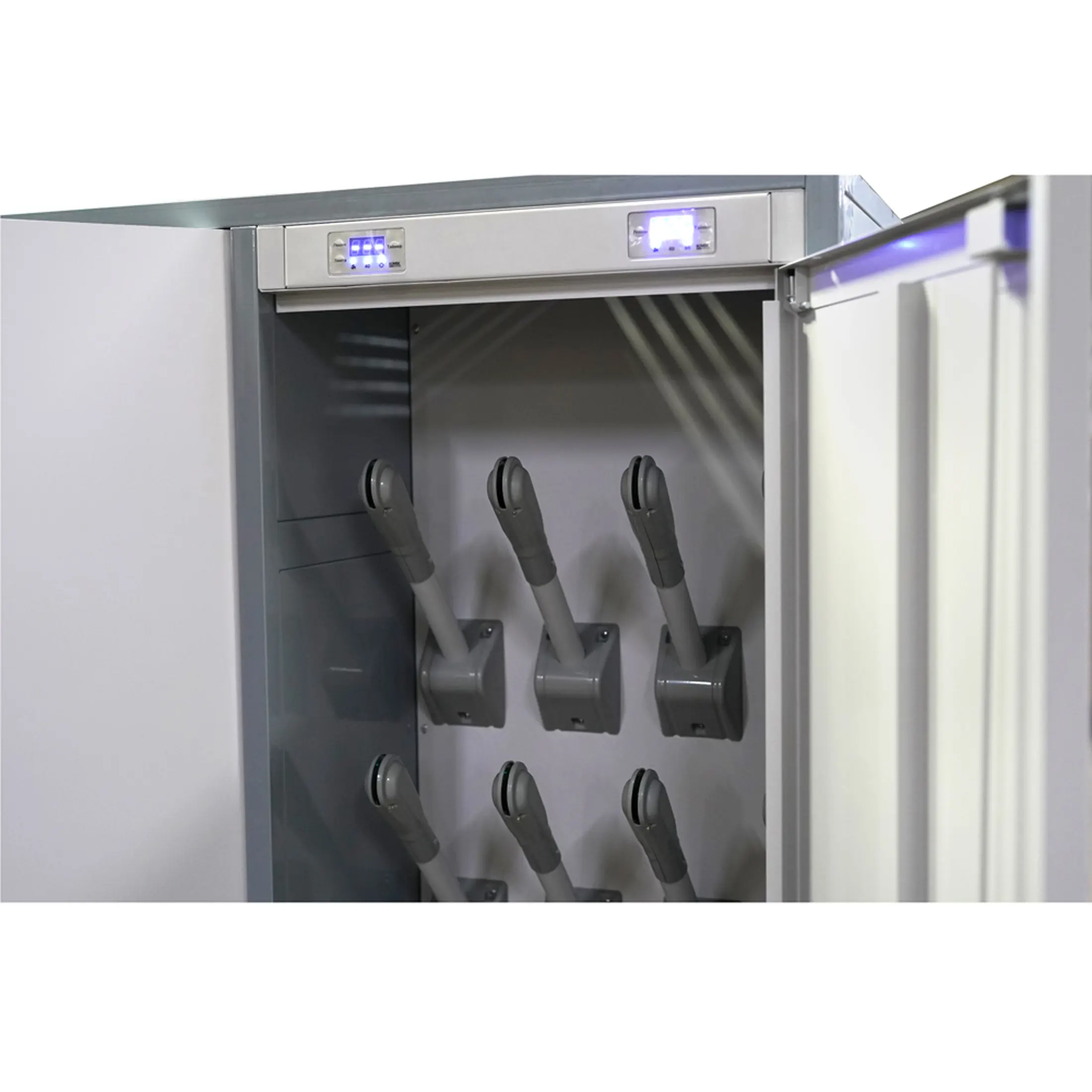 - Высокая производительность и вместимость — шкаф рассчитан на загрузку значительных объемов одежды и обуви за один цикл, что позволяет эффективно обслуживать большие коллективы на предприятиях, в спортивных комплексах или медицинских стационарах.