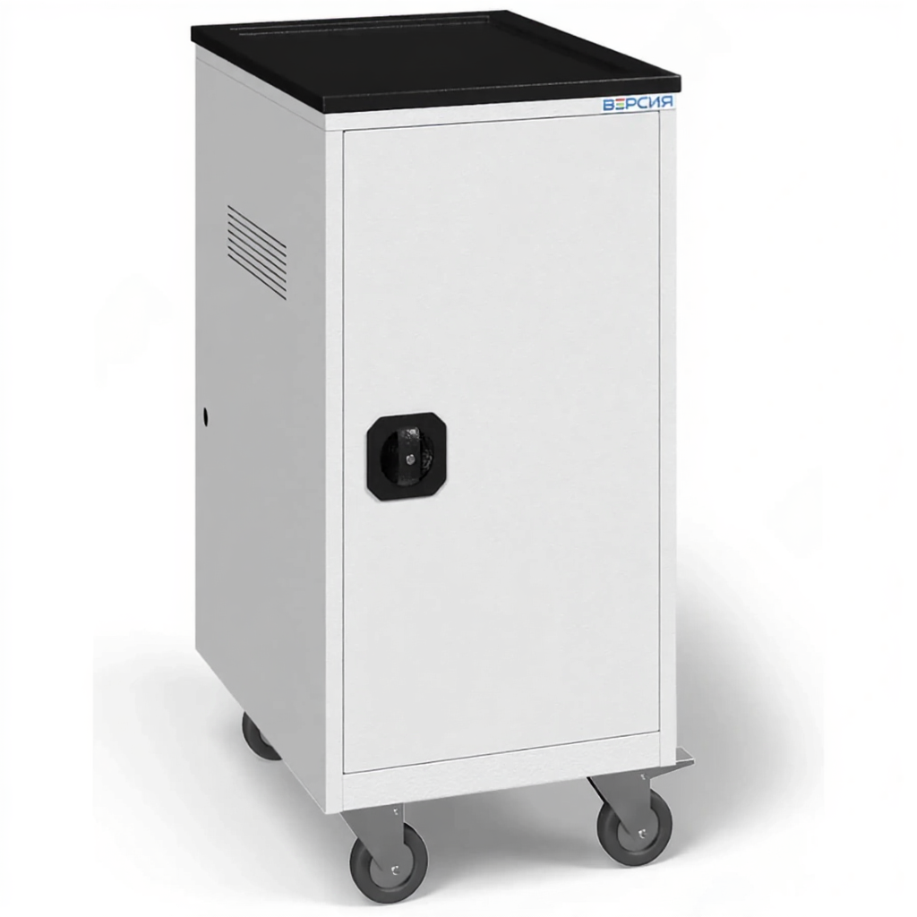 - Мобильность и базовая защита — оснащена колесами для перемещения и, как правило, защитным каркасом или бортами, который предотвращает падение ноутбуков во время движения. Часто имеет общий замок для ограничения доступа.