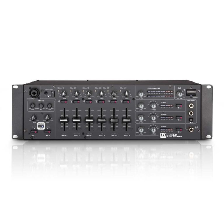 Зонный микшер LD Systems ZONE 624 – четырехзонный полнофункциональный микшер с шестью линейными и двумя микрофонными входами, которые можно направить на стереофонический или монофонический мастер-выход. В ZONE 624 предусмотрен вход для системы пожарного оповещения с собственным регулятором громкости и дистанционное включение/отключение звука. Компактный микшер, высотой 3U, подойдет для управления акустическими системами в отелях, фитнес-центрах, супермаркетах, клубах. Два микрофонных балансных входа оснащены регулировкой уровня и кнопкой TalkOver, фантомным питанием 12 В и трехполосным эквалайзером. Уровень аттенюации TalkOver может быть индивидуально установлен для всех выходов на задней панели устройства. Шесть стерео входов ZONE 624 оснащены регулировкой чувствительности, светодиодной индикацией, 45-миллиметровыми фейдерами, кнопками Cue и RCA-коннекторами. Шестой канал специально разработан для балансных сигналов FOH. Кроме того, микшер имеет входы 3.5 мм TRS и USB-порт, выход для наушников для предпрослушивания, а также выход для звукозаписи. USB-порт используется в качестве стереовхода и выхода, и позволяет использовать микшер как внешний аудиоинтерфейс. Балансные выходы мастер секции выполнены на разъемах XLR и клеммах, а стерео зона оснащена RCA коннекторами. Максимальный уровень для зон может быть задан индивидуально. Три моно выхода микшера имеют 2-х полосный эквалайзер, Hi-pass фильтр, переключатель Mute с индикацией. Вход с 1 по 6 или стерео мастер может быть выбран как источник. Стерео выход оснащен трехполосным эквалайзером и регулировкой чувствительности, функцией Talkover, а также светодиодной индикацией уровня.