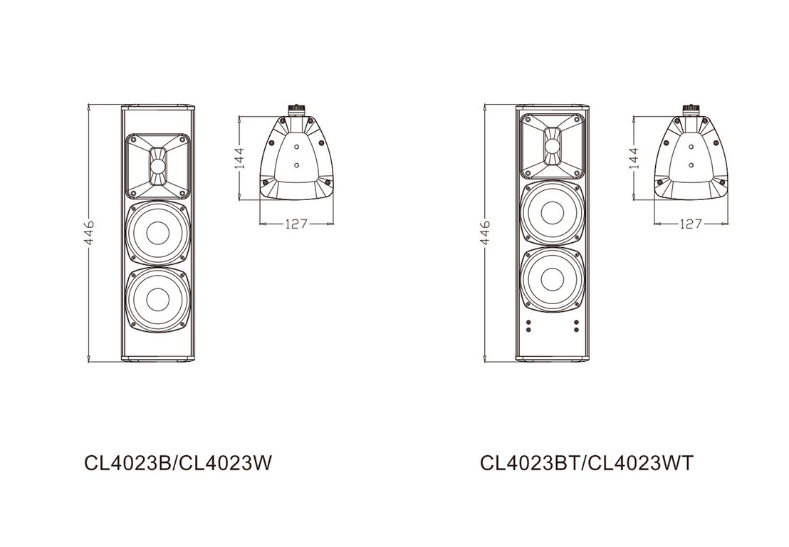 Серия CL4023 представляет собой акустическую систему колонного типа с различными цветами и функциями. Продукт соответствует стандарту IP56. Звук мягкий и сбалансированный. Корпус изготовлен из алюминиевого сплава. Буквы B и W после модели обозначают черный и белый цвет соответственно, а буква T представляет собой конфигурацию с трансформатором.