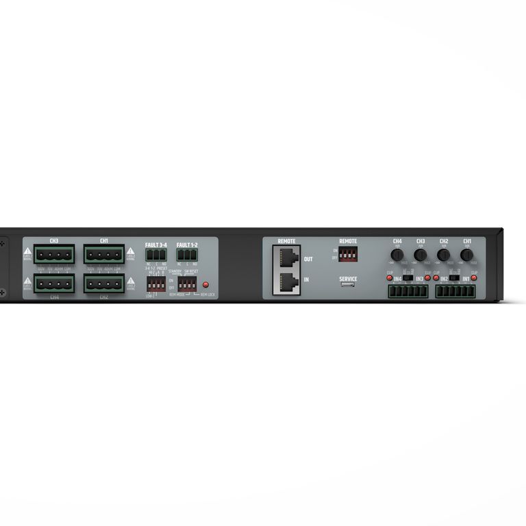 • Усилитель мощности класса D c 4 каналами x 120 Вт @ 4 Ом/100В/70В
